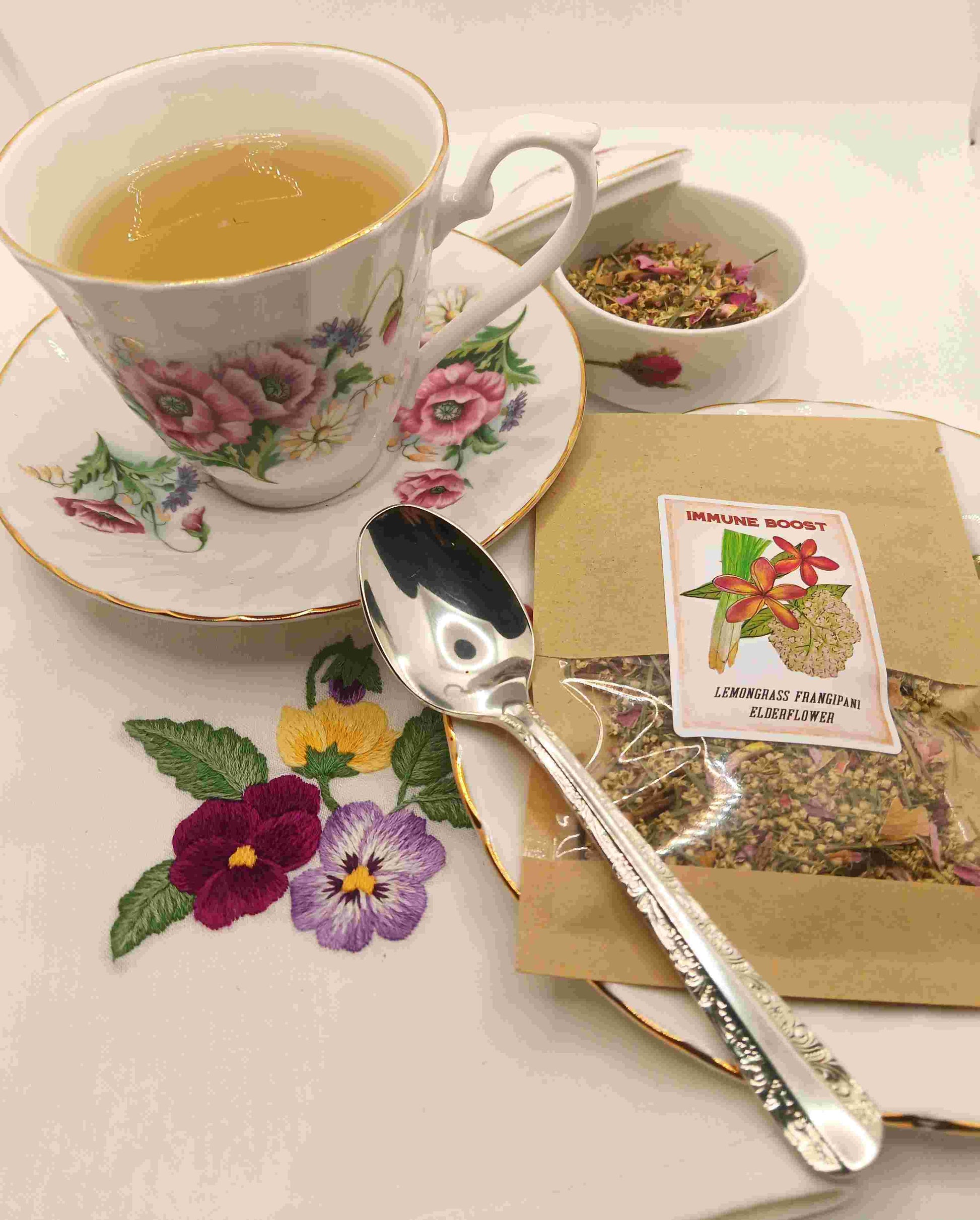 Farm Emporiums Immune Boost Tea Blend features the exquisite flavours of lemongrass, frangipani, and elderflower offering a refreshing and invigorating taste that uplifts the senses and boosts overall well-being.